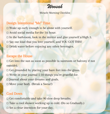 Your gifts for purchasing the transformative book, "Woosah - 10 Holistic Ways to Feel 20 Years Younger," are two invaluable guides designed to support your holistic health journey. These complimentary tools are crafted to help you start your day right and manage anxiety effectively, amplifying the benefits of the principles shared in the book.